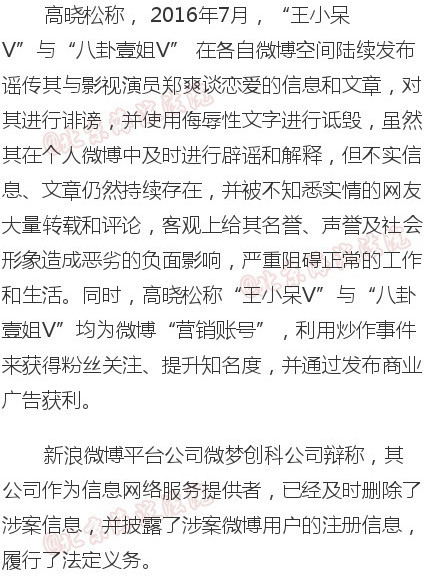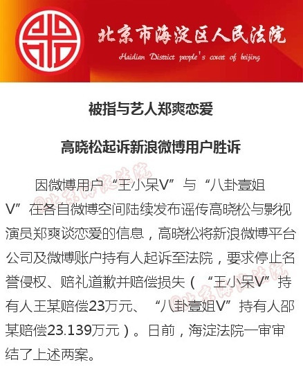 此前网友发布谣传高晓松和郑爽谈恋爱的信息,被高晓松诉至法院,要求停止名誉侵权、赔礼道歉并赔偿损失。高晓松称两位网友发布谣传信息和文章,对其进行诽谤,并使用侮辱性文字进行诋毁,利用炒作事件来获得粉丝关注、提升知名度,并通过发布商业广告获利。
