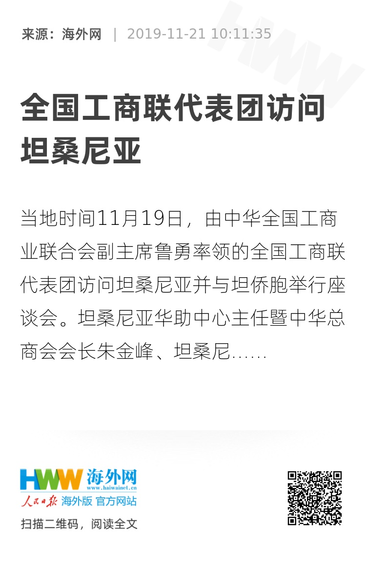 当地时间11月19日,由中华全国工商业联合会副主席鲁勇率领的全国工商联代表团访问坦桑尼亚并与坦侨胞举行座谈会。坦桑尼亚华助中心主任暨中华总商会会长朱金峰、坦桑尼亚旅游与餐饮协会会长潘磊、坦桑尼亚中国和平统一促进会冯振宇等侨领出席座谈会。