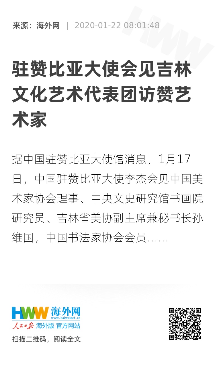 据中国驻赞比亚大使馆消息,1月17日,中国驻赞比亚大使李杰会见中国美术家协会理事、中央文史研究馆书画院研究员、吉林省美协副主席兼秘书长孙维国,中国书法家协会会员、中国硬笔书法协会理事、中国关东书画家协会会长苗世魁,中国书画艺术研究院高级研究员、中国艺术学会会员杨强等吉林文化艺术代表团访赞艺术家。