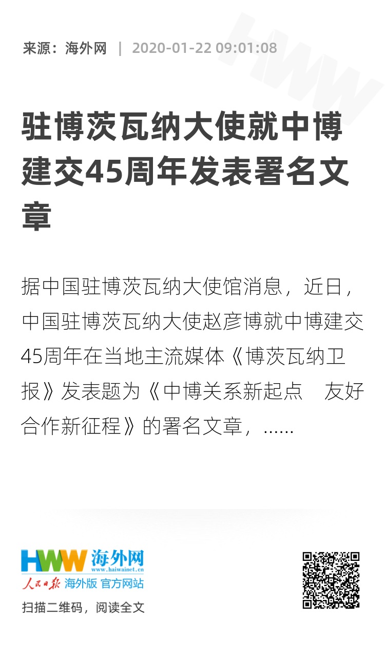 据中国驻博茨瓦纳大使馆消息,近日,中国驻博茨瓦纳大使赵彦博就中博建交45周年在当地主流媒体《博茨瓦纳卫报》发表题为《中博关系新起点 友好合作新征程》的署名文章,全文如下: