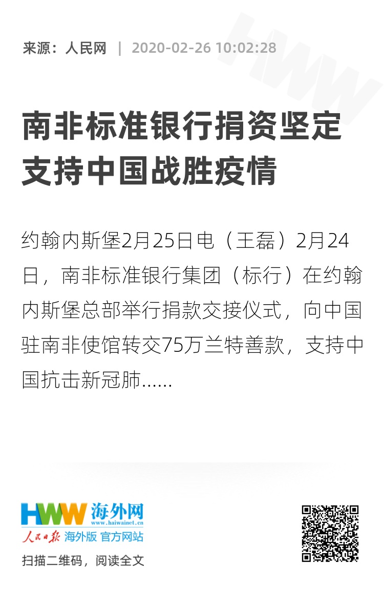 沙巴拉拉首席执行官表示,我们对中国有能力和资源战胜疫情充满信心。尽管深知南非和其他非洲国家也有抗击疫情的迫切需要,且自身经济也面临不少困难和挑战,但基于南中兄弟般的深情厚谊和团结协作精神,在中国人民全力抗击疫情的关键时刻,标行毅然决定向中国捐赠75万兰特现汇,以尽微薄之力,坚定支持中国战胜疫情。中国政府和人民以坚强韧性和超强能力,快速有效遏制疫情传播蔓延,为维护全人类的生命安全做出了巨大贡献,令人感动和钦佩。此次捐赠数目虽不大,但却代表着标行和南非人民对中国战胜疫情的坚定支持和强大信心,相信中国必将很快赢得最后胜利。