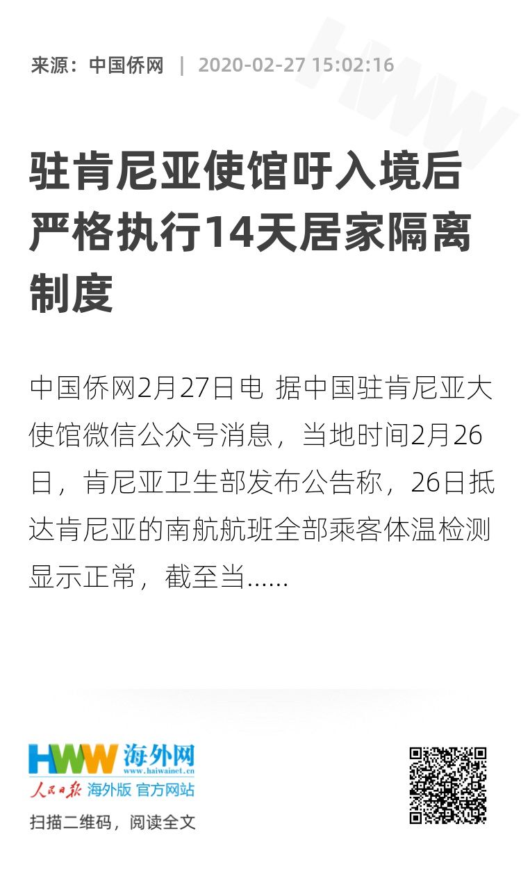 驻肯尼亚使馆吁入境后严格执行14天居家隔离制度