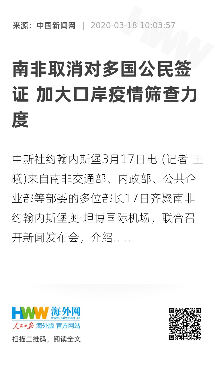 3月15日,南非总统拉马福萨宣布进入国家灾难状态,其中包括暂停发放对意大利、美国、中国、伊朗等国家或地区的入境签证。17日晚,南非内政部长阿隆·莫茨索拉迪(Aaron Motsoaledi)证实,自南非进入国家灾难状态后,截至目前,南非政府已将今年前两个月内对上述国家发放的签证取消。