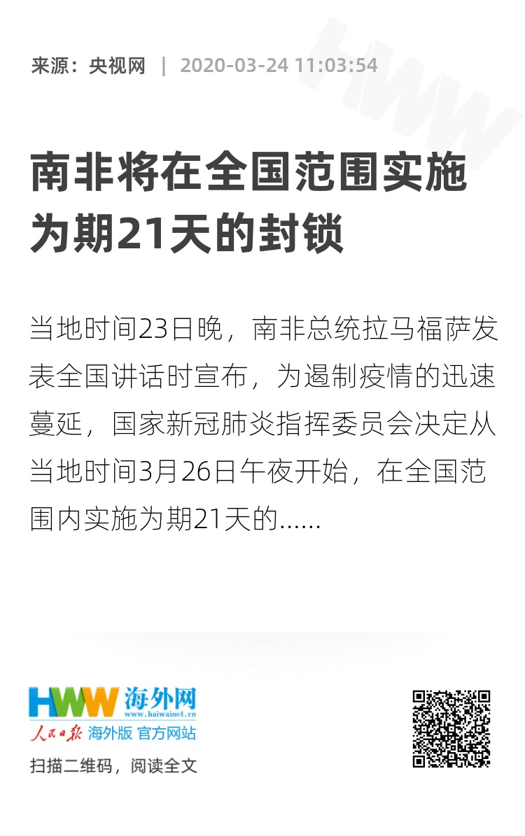 当地时间23日晚,南非总统拉马福萨发表全国讲话时宣布,为遏制疫情的迅速蔓延,国家新冠肺炎指挥委员会决定从当地时间3月26日午夜开始,在全国范围内实施为期21天的封锁,封锁持续到4月16日午夜。在此期间,所有人除非必要不得外出。