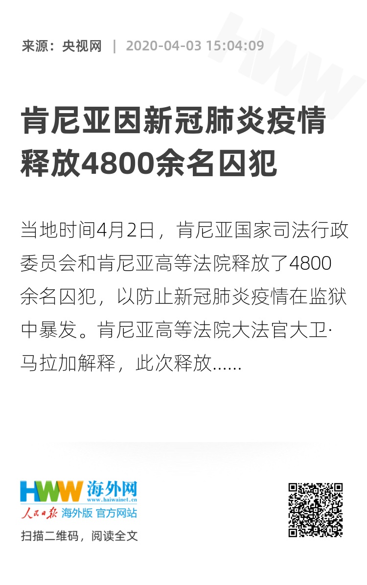 当地时间4月2日,肯尼亚国家司法行政委员会和肯尼亚高等法院释放了4800余名囚犯,以防止新冠肺炎疫情在监狱中暴发。肯尼亚高等法院大法官大卫·马拉加解释,此次释放的4800余名囚犯包括刑期在半年以下的轻罪犯人以及剩余刑期不到半年的囚犯。