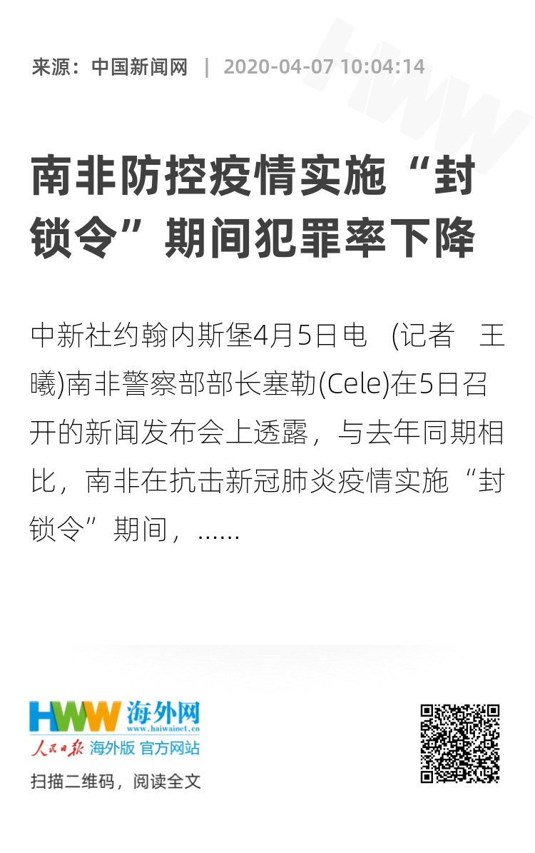中新社约翰内斯堡4月5日电 (记者 王曦)南非警察部部长塞勒(Cele)在5日召开的新闻发布会上透露,与去年同期相比,南非在抗击新冠肺炎疫情实施“封锁令”期间,犯罪率明显下降。