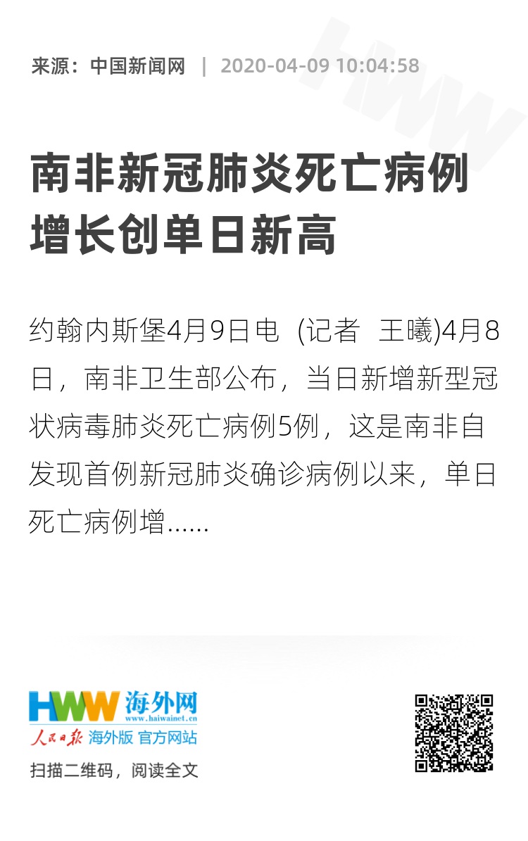 中新网约翰内斯堡4月9日电 (记者 王曦)4月8日,南非卫生部公布,当日新增新型冠状病毒肺炎死亡病例5例,这是南非自发现首例新冠肺炎确诊病例以来,单日死亡病例增长最多的一天。