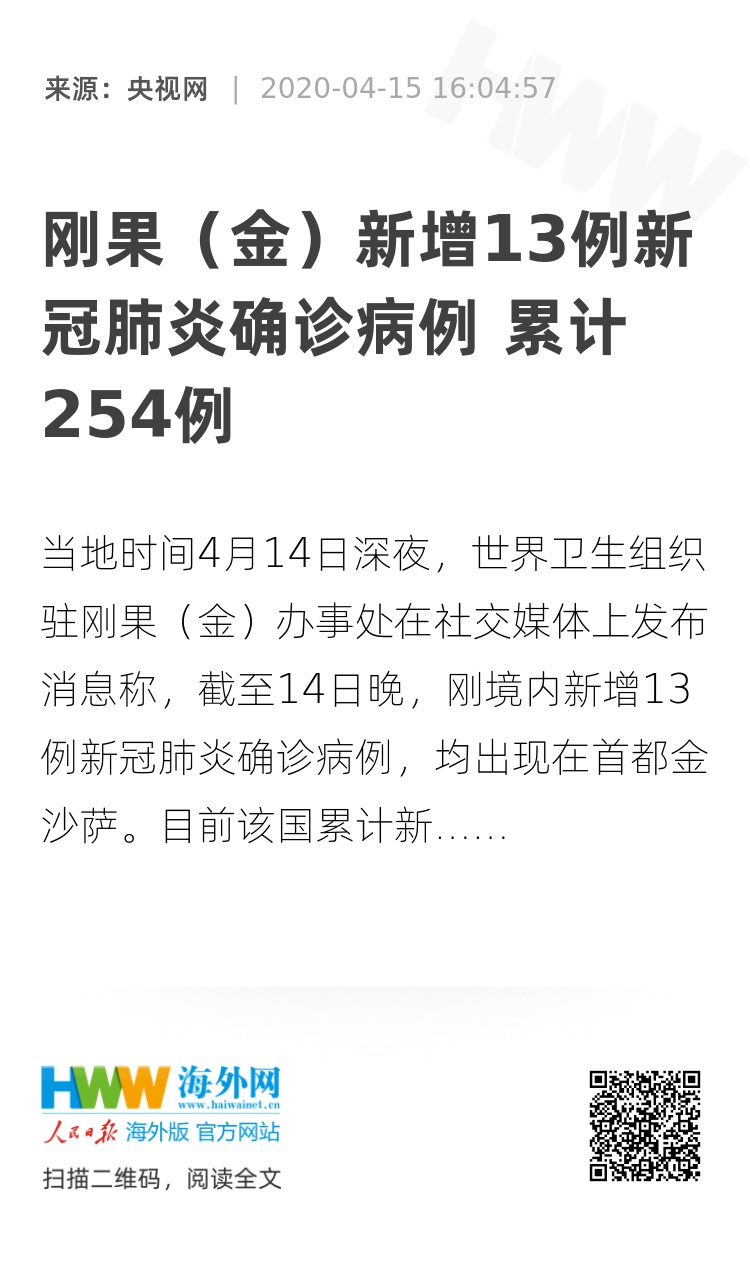 当地时间4月14日深夜,世界卫生组织驻刚果(金)办事处在社交媒体上发布消息称,截至14日晚,刚境内新增13例新冠肺炎确诊病例,均出现在首都金沙萨。目前该国累计新冠肺炎确诊病例254例,死亡病例21例,治愈病例21例。(总台记者 白洁)