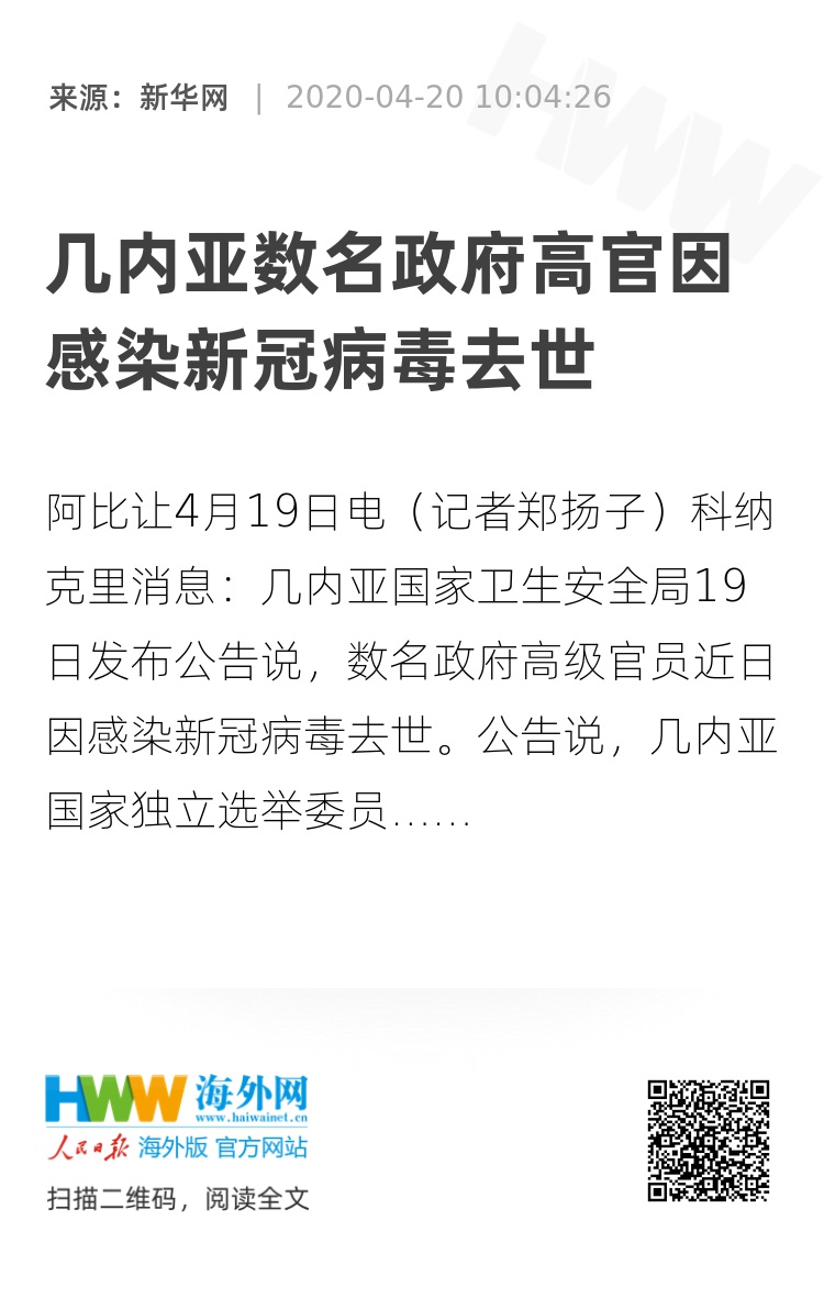 新华社阿比让4月19日电(记者郑扬子)科纳克里消息:几内亚国家卫生安全局19日发布公告说,数名政府高级官员近日因感染新冠病毒去世。