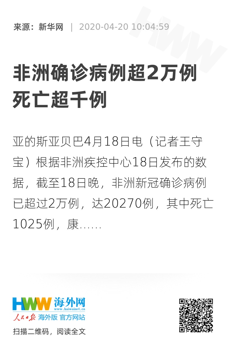 新华社亚的斯亚贝巴4月18日电(记者王守宝)根据非洲疾控中心18日发布的数据,截至18日晚,非洲新冠确诊病例已超过2万例,达20270例,其中死亡1025例,康复4700例。