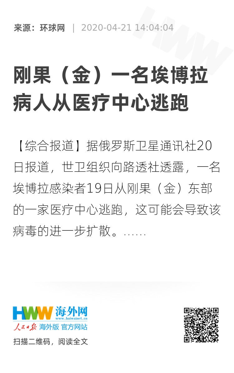 【环球网综合报道】据俄罗斯卫星通讯社20日报道,世卫组织向路透社透露,一名埃博拉感染者19日从刚果(金)东部的一家医疗中心逃跑,这可能会导致该病毒的进一步扩散。