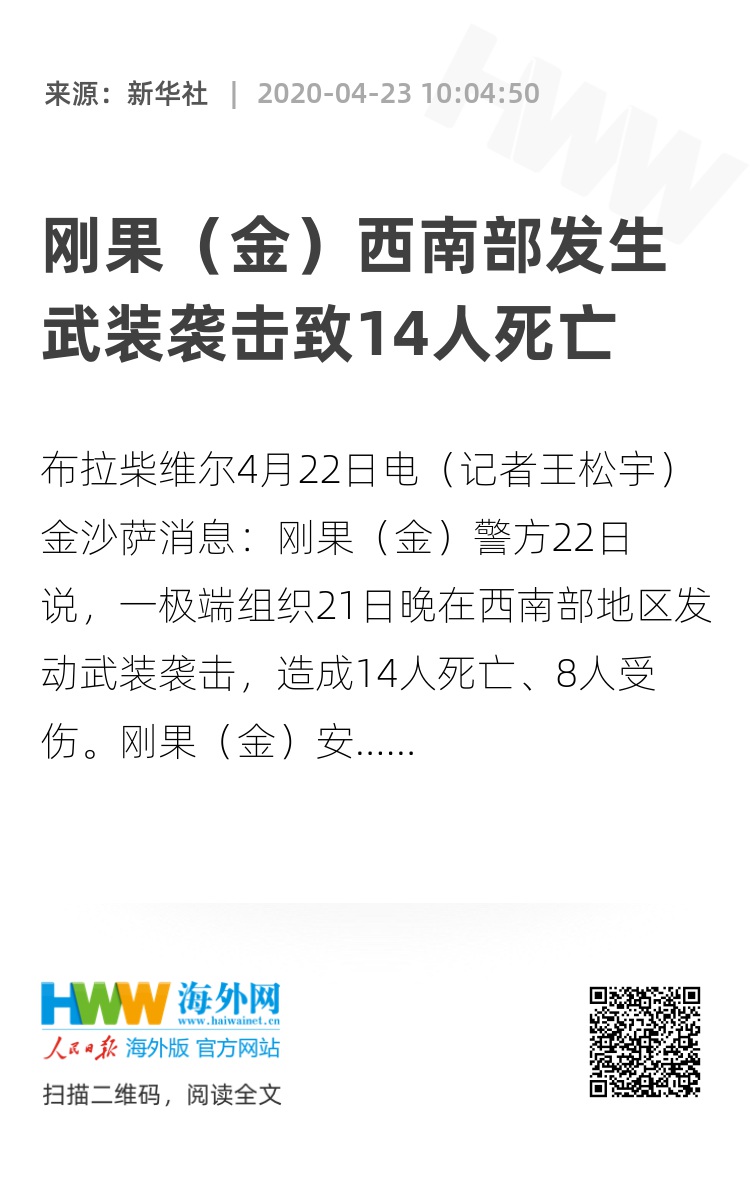 新华社布拉柴维尔4月22日电(记者王松宇)金沙萨消息:刚果(金)警方22日说,一极端组织21日晚在西南部地区发动武装袭击,造成14人死亡、8人受伤。