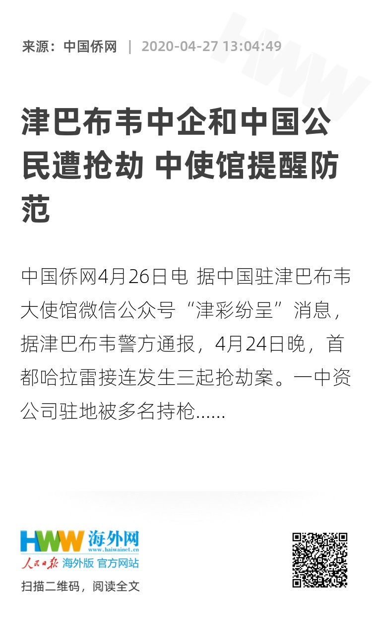 津巴布韦中企和中国公民遭抢劫 中使馆提醒防范