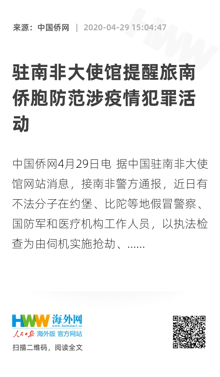 驻南非大使馆提醒旅南侨胞防范涉疫情犯罪活动