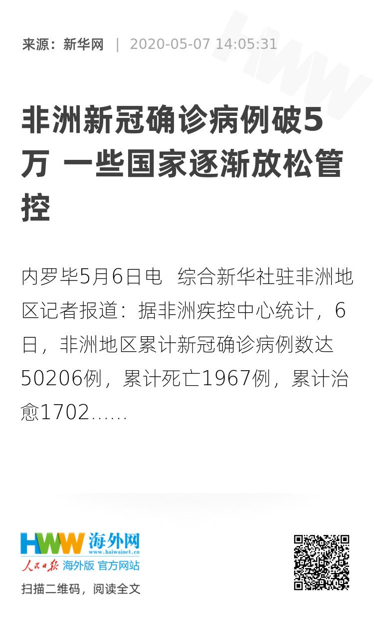 新华社内罗毕5月6日电 综合新华社驻非洲地区记者报道:据非洲疾控中心统计,6日,非洲地区累计新冠确诊病例数达50206例,累计死亡1967例,累计治愈17021例。许多国家确诊病例数继续攀升,但也有一些国家逐渐放松管控。