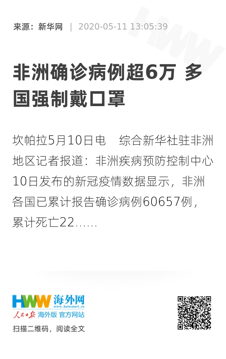 新华社坎帕拉5月10日电 综合新华社驻非洲地区记者报道:非洲疾病预防控制中心10日发布的新冠疫情数据显示,非洲各国已累计报告确诊病例60657例,累计死亡2223例,累计治愈20792例。一些国家要求民众在公共场所必须佩戴口罩。