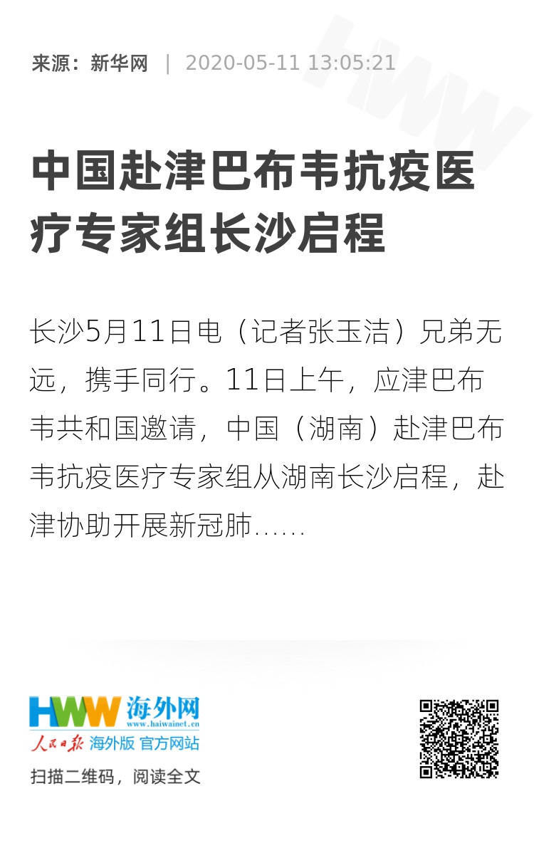 新华社长沙5月11日电(记者张玉洁)兄弟无远,携手同行。11日上午,应津巴布韦共和国邀请,中国(湖南)赴津巴布韦抗疫医疗专家组从湖南长沙启程,赴津协助开展新冠肺炎疫情防控工作。专家组还随机携带了由湖南省人民政府捐赠的医疗防护物资。