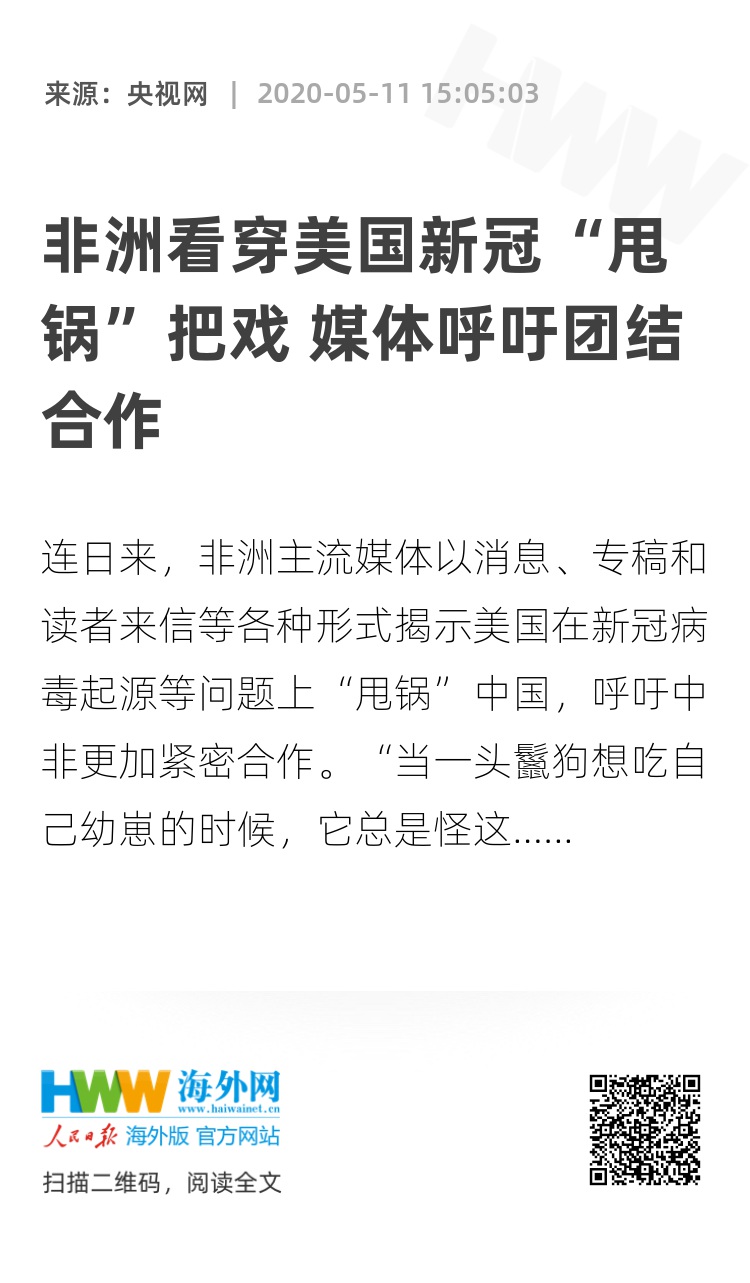 “非洲应该效仿而非诋毁中国”,针对美国“甩锅”中国,5月6日,南非知名媒体网站“索韦托人”在线刊发评论文章,指出“随着新冠病毒继续在世界各地肆虐,错误信息、恐惧、虚假治疗、假新闻和恶作剧也在继续”,对中国的攻击,“目的是诋毁、歪曲、攻击中非双边伙伴关系,损害中国对非影响和双方在相互尊重、互利共赢基础上建立合作的努力”。文章呼吁:“非洲应该跟随中国的脚步,而不是散布不公平和不必要的仇恨。”