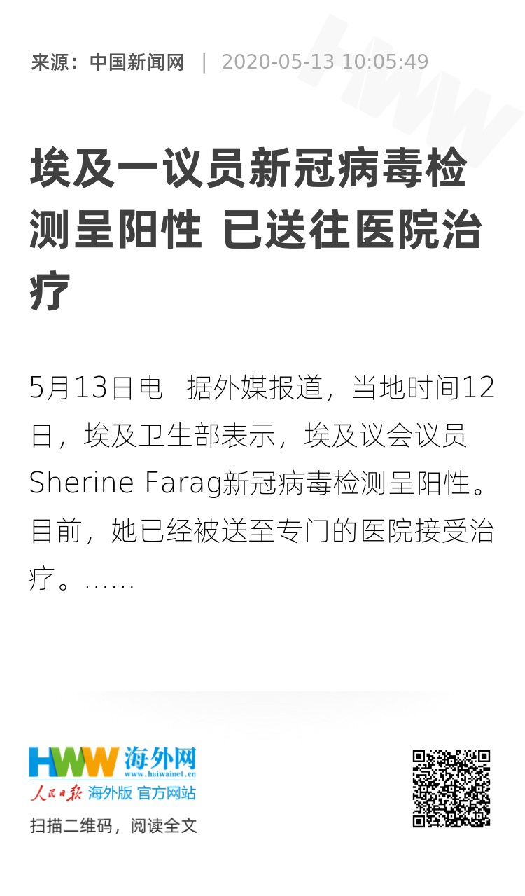中新网5月13日电 据外媒报道,当地时间12日,埃及卫生部表示,埃及议会议员Sherine Farag新冠病毒检测呈阳性。目前,她已经被送至专门的医院接受治疗。