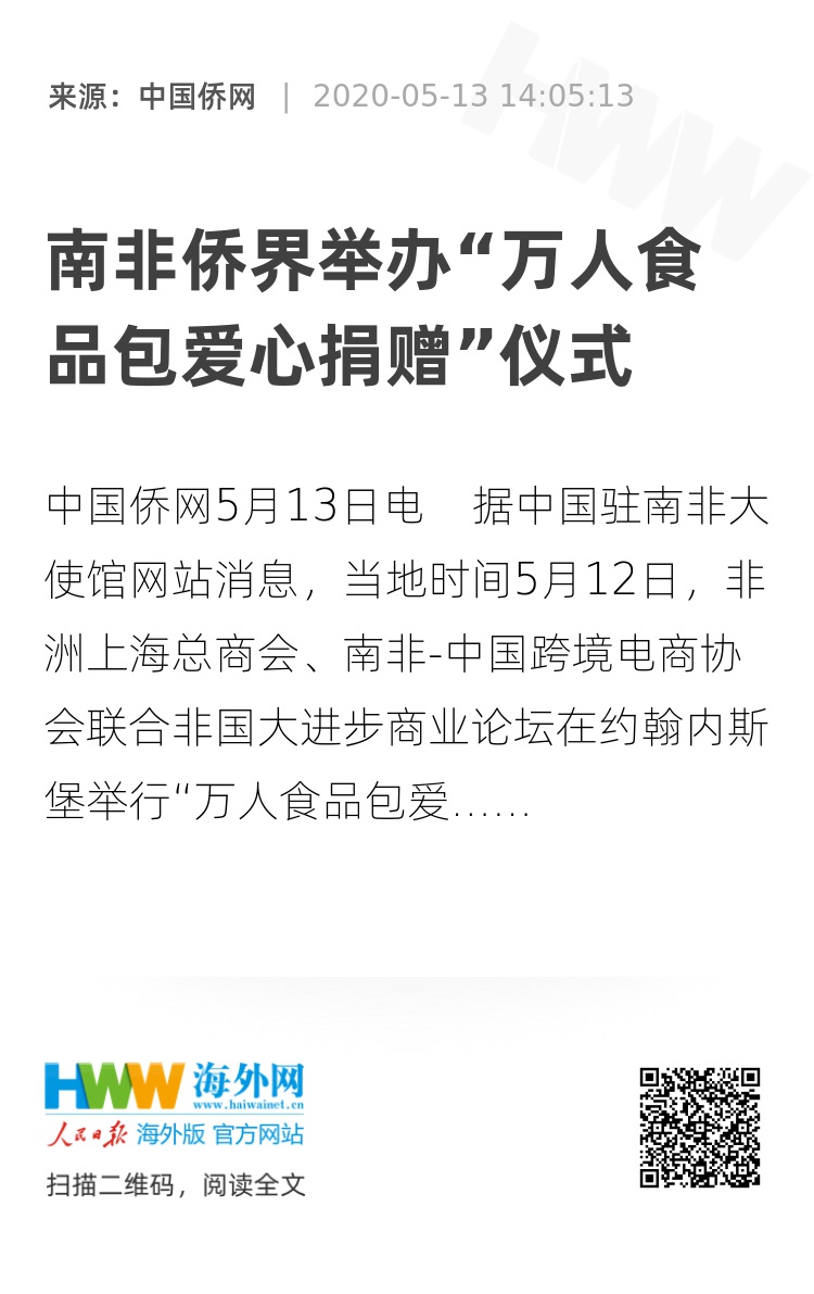 中国侨网5月13日电 据中国驻南非大使馆网站消息,当地时间5月12日,非洲上海总商会、南非-中国跨境电商协会联合非国大进步商业论坛在约翰内斯堡举行“万人食品包爱心捐赠”仪式,向当地贫困社区捐赠价值近80万兰特食品包。中国驻南非大使馆临时代办李南、南非执政党非国大总司库马沙蒂勒、非国大进步商业论坛召集人穆勒、非洲上海总商会会长朱寿南等出席仪式并致辞。