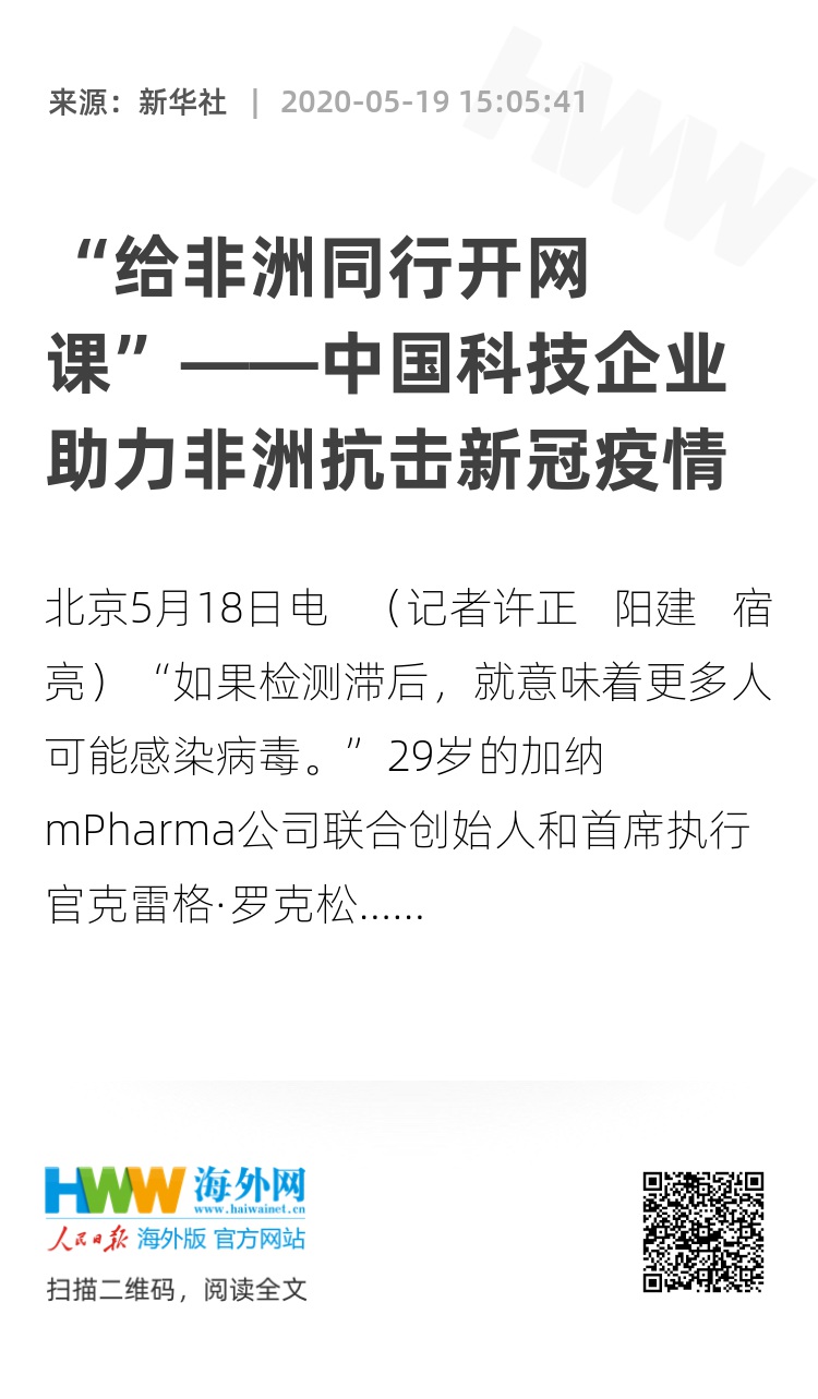 新华社北京5月18日电 (记者许正 阳建 宿亮)“如果检测滞后,就意味着更多人可能感染病毒。”29岁的加纳mPharma公司联合创始人和首席执行官克雷格·罗克松近日在加纳首都阿克拉告诉新华社记者。