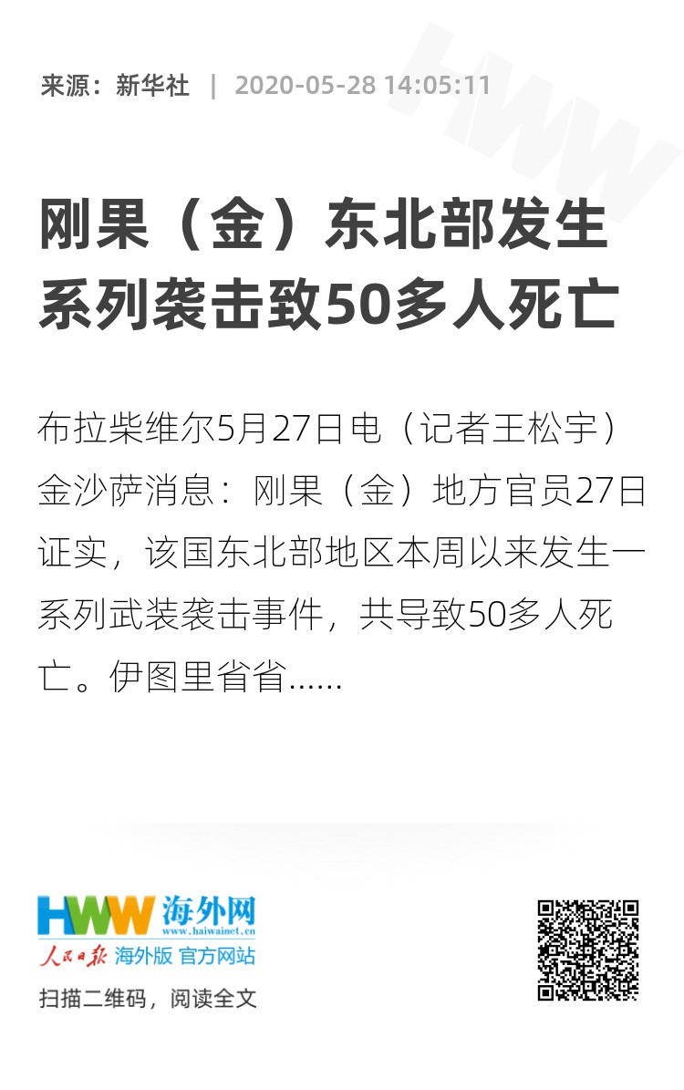 新华社布拉柴维尔5月27日电(记者王松宇)金沙萨消息:刚果(金)地方官员27日证实,该国东北部地区本周以来发生一系列武装袭击事件,共导致50多人死亡。