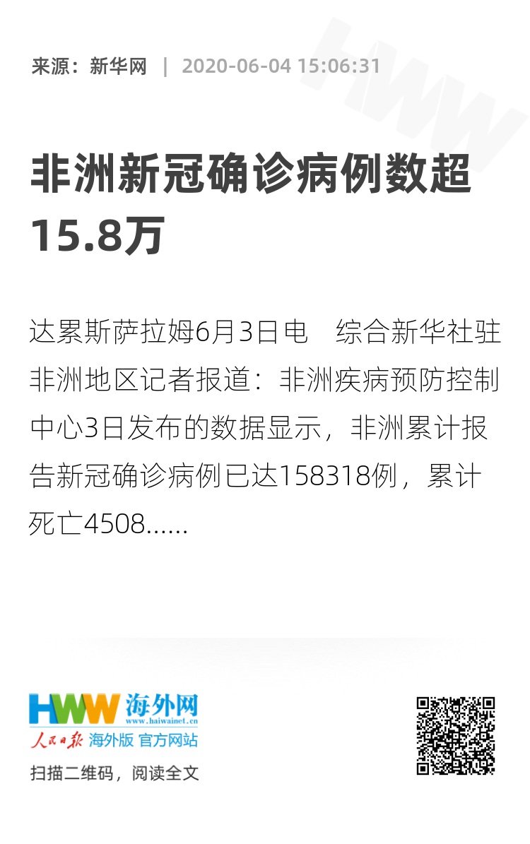 新华社达累斯萨拉姆6月3日电 综合新华社驻非洲地区记者报道:非洲疾病预防控制中心3日发布的数据显示,非洲累计报告新冠确诊病例已达158318例,累计死亡4508例,累计治愈67630例。