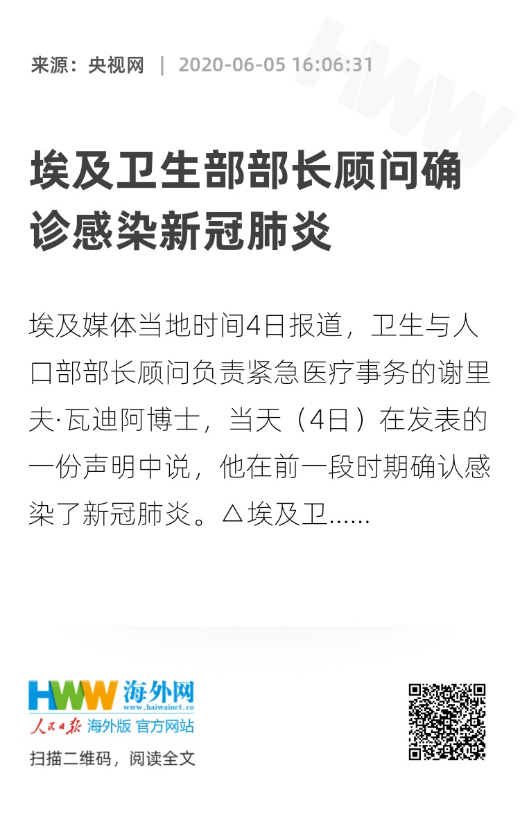 埃及媒体当地时间4日报道,卫生与人口部部长顾问负责紧急医疗事务的谢里夫·瓦迪阿博士,当天(4日)在发表的一份声明中说,他在前一段时期确认感染了新冠肺炎。