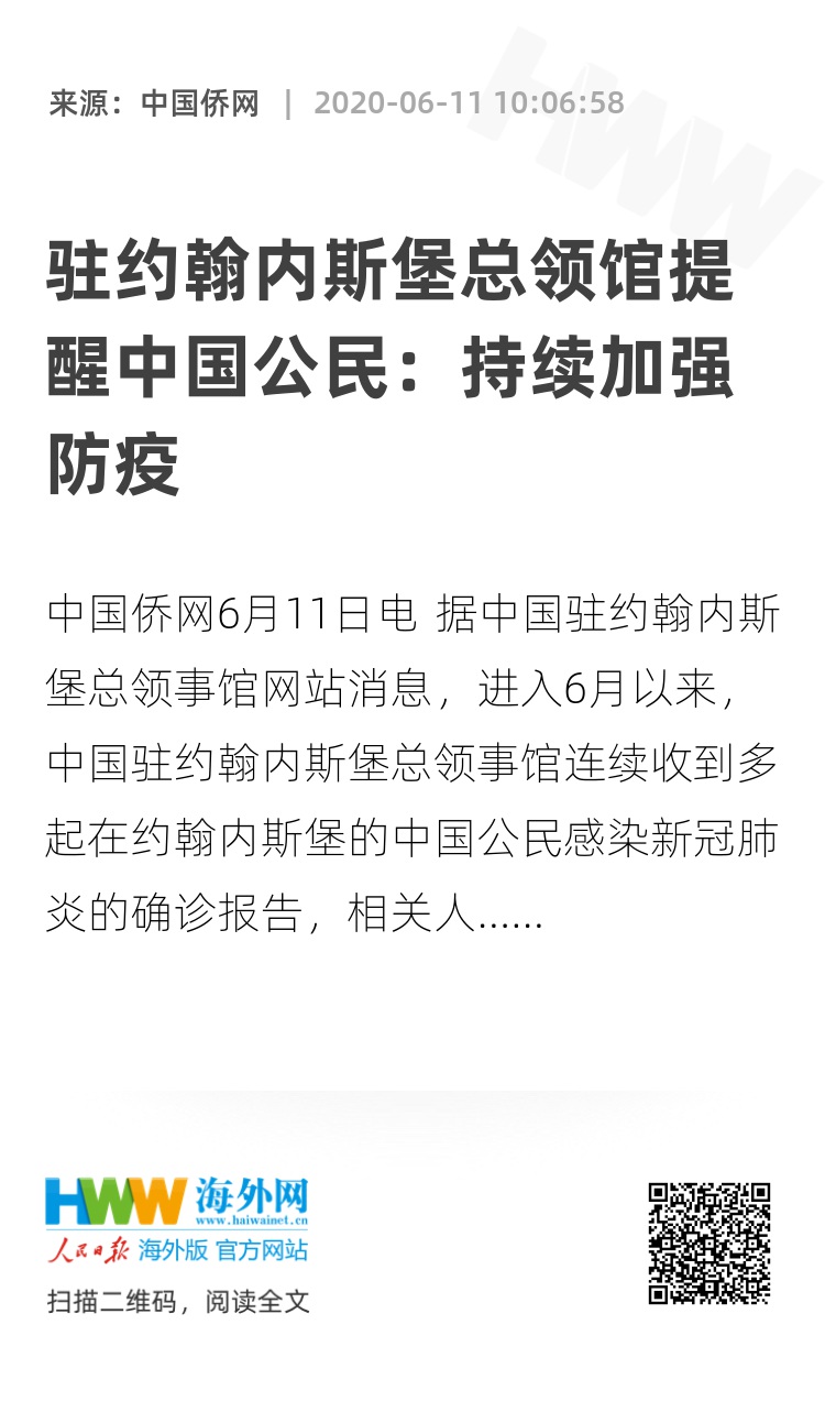 中国侨网6月11日电 据中国驻约翰内斯堡总领事馆网站消息,进入6月以来,中国驻约翰内斯堡总领事馆连续收到多起在约翰内斯堡的中国公民感染新冠肺炎的确诊报告,相关人员有程度不同的发烧、咳嗽、全身乏力等早期症状,已联系医生诊疗或送院治疗,同时对相关人员密切接触情况也在排查之中,并采取了自我隔离和医学观察等措施。