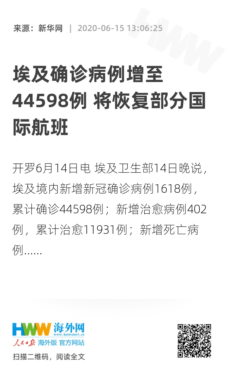 新华社开罗6月14日电 埃及卫生部14日晚说,埃及境内新增新冠确诊病例1618例,累计确诊44598例;新增治愈病例402例,累计治愈11931例;新增死亡病例91例,累计死亡1575例。