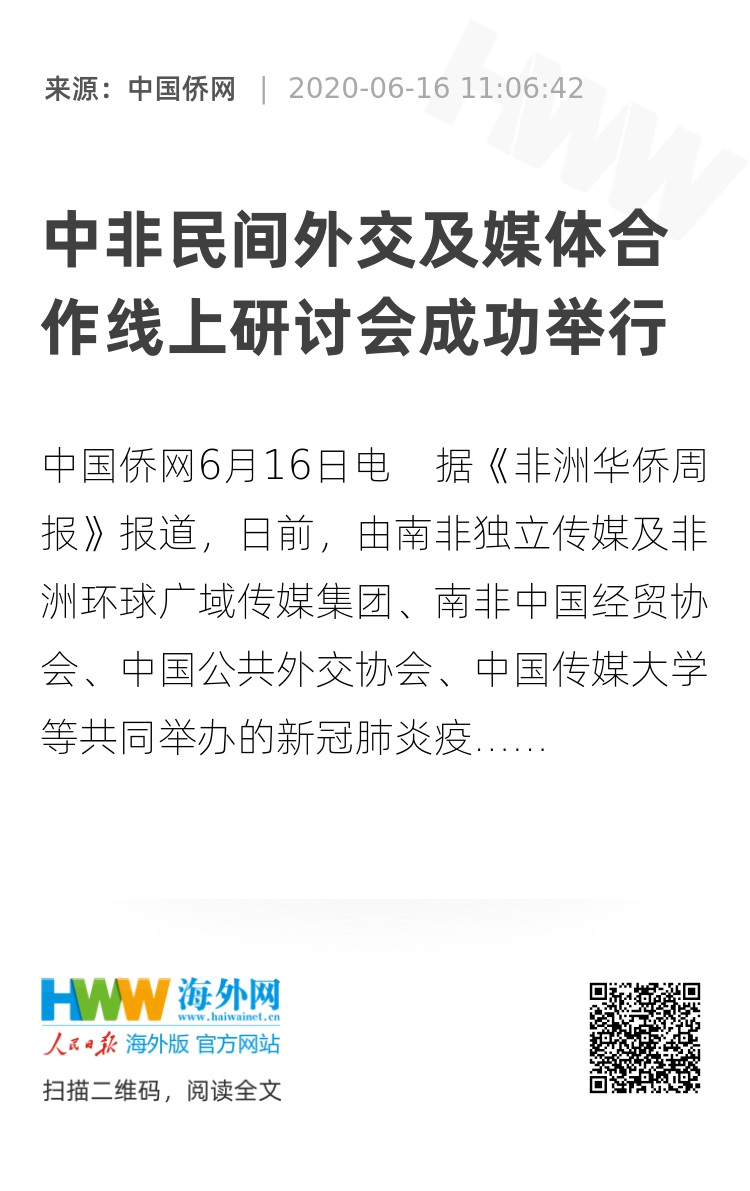 中国侨网6月16日电 据《非洲华侨周报》报道,日前,由南非独立传媒及非洲环球广域传媒集团、南非中国经贸协会、中国公共外交协会、中国传媒大学等共同举办的新冠肺炎疫情下中非民间外交及媒体合作线上研讨会成功举行,来自中非各界近100人线上与会。