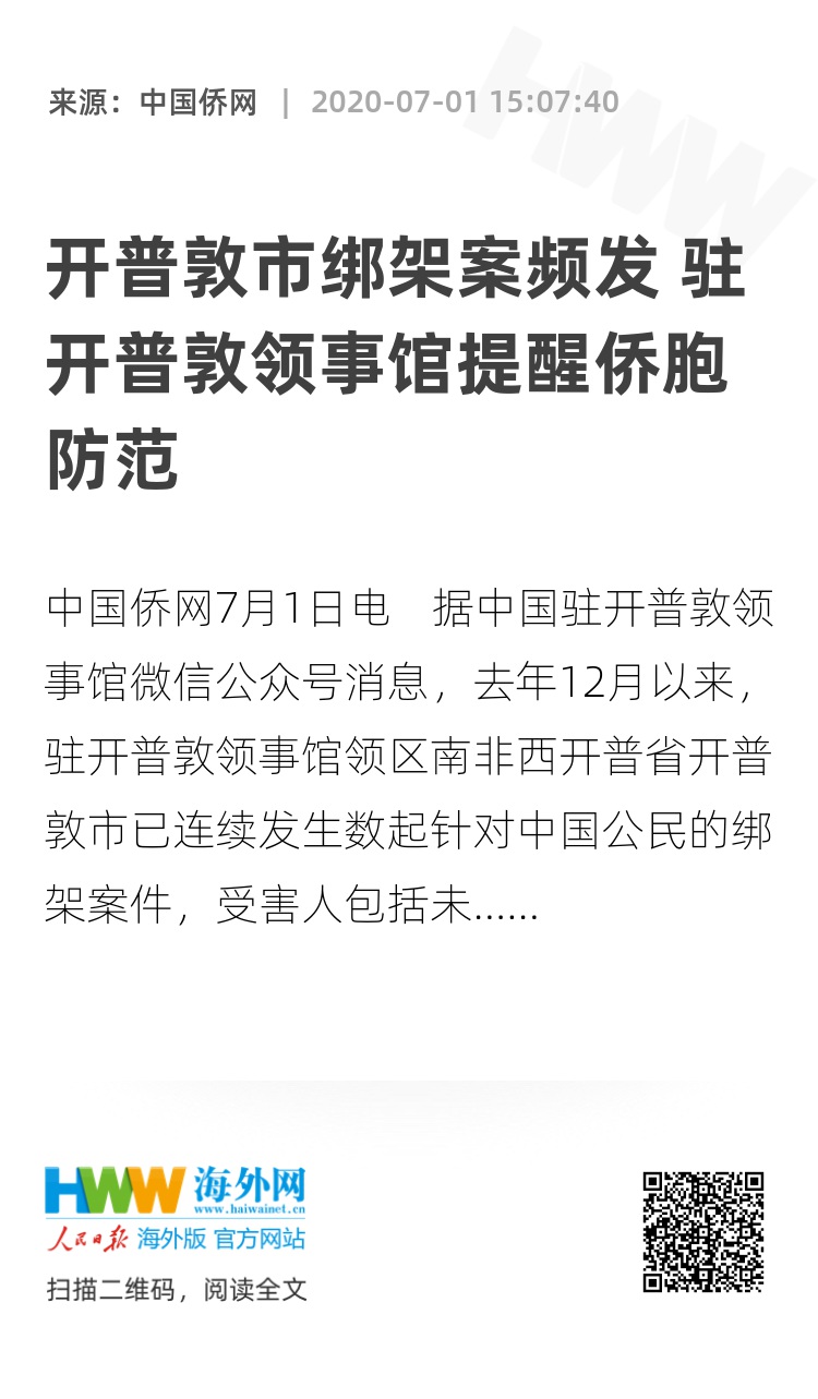 中国侨网7月1日电 据中国驻开普敦领事馆微信公众号消息,去年12月以来,驻开普敦领事馆领区南非西开普省开普敦市已连续发生数起针对中国公民的绑架案件,受害人包括未成年侨胞。绑匪惯用手法为尾随跟踪受害者,诱骗受害人下车或在偏僻路段实施绑架,劫持至Khayelitsha、Philippi等贫民聚居区后,向其家属索要高额赎金。目前,被绑架侨胞均已平安返家,有关案件尚在侦破中。