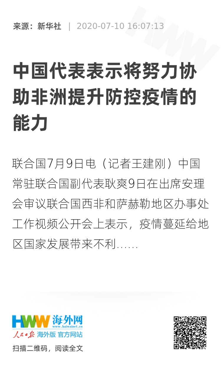 中国代表表示将努力协助非洲提升防控疫情的能力