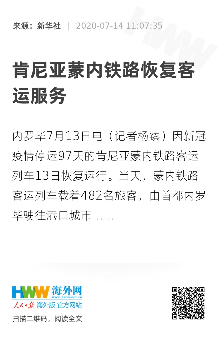 据介绍,为恢复客运,非洲之星铁路运营公司按照肯交通部恢复旅客运输的指示,制定了客运服务防疫手册,组织当地返岗复工员工进行核酸检测,并开展了防疫培训、防疫物资配置、机车车辆检测等各方面准备工作。