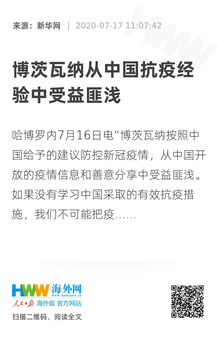 新华社哈博罗内7月16日电“博茨瓦纳按照中国给予的建议防控新冠疫情,从中国开放的疫情信息和善意分享中受益匪浅。如果没有学习中国采取的有效抗疫措施,我们不可能把疫情控制在现在的程度。”博茨瓦纳总统新闻秘书里哈贾日前在接受新华社记者电话采访时如是说。