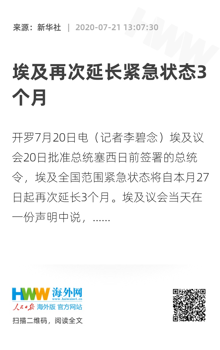 埃及议会当天在一份声明中说,考虑到目前埃及国内公共卫生和安全形势,议会做出了继续延长紧急状态的决定。