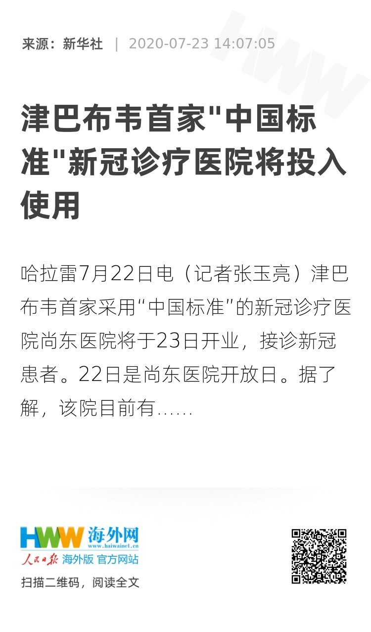 新华社哈拉雷7月22日电(记者张玉亮)津巴布韦首家采用“中国标准”的新冠诊疗医院尚东医院将于23日开业,接诊新冠患者。