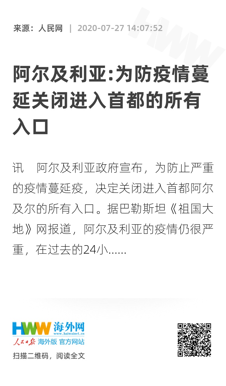 人民网讯 阿尔及利亚政府宣布,为防止严重的疫情蔓延疫,决定关闭进入首都阿尔及尔的所有入口。