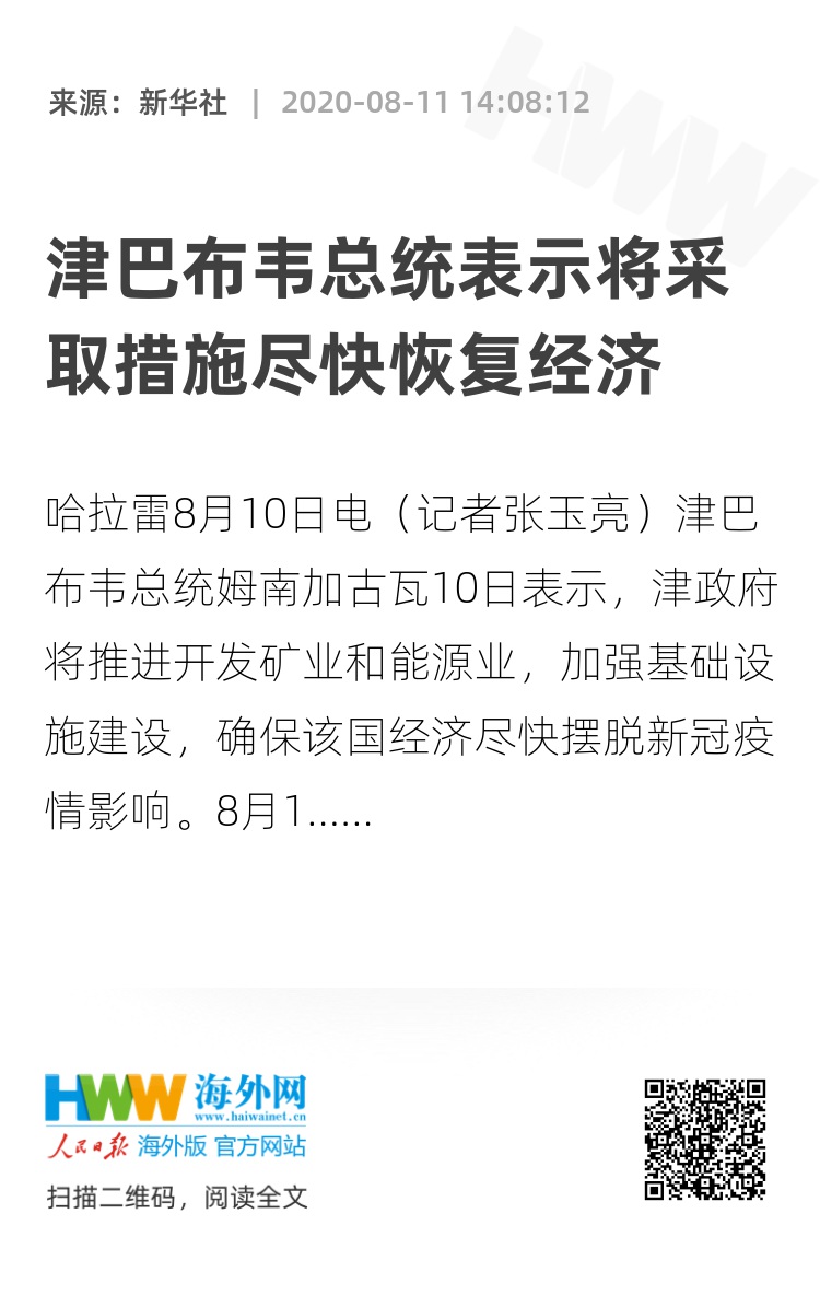 新华社哈拉雷8月10日电(记者张玉亮)津巴布韦总统姆南加古瓦10日表示,津政府将推进开发矿业和能源业,加强基础设施建设,确保该国经济尽快摆脱新冠疫情影响。