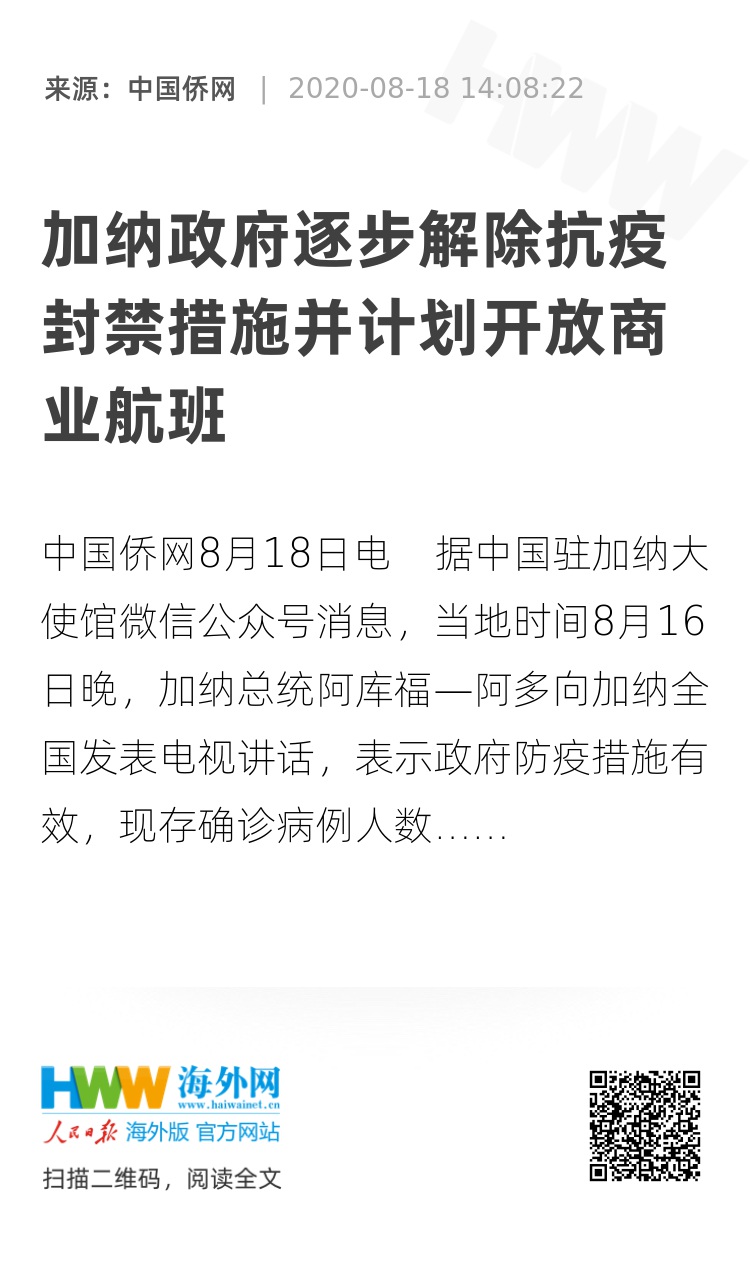 中国侨网8月18日电 据中国驻加纳大使馆微信公众号消息,当地时间8月16日晚,加纳总统阿库福—阿多向加纳全国发表电视讲话,表示政府防疫措施有效,现存确诊病例人数持续下降,确诊患者死亡率在非洲乃至全世界均属较低水平,政府将继续解除抗疫封禁措施。主要举措如下: