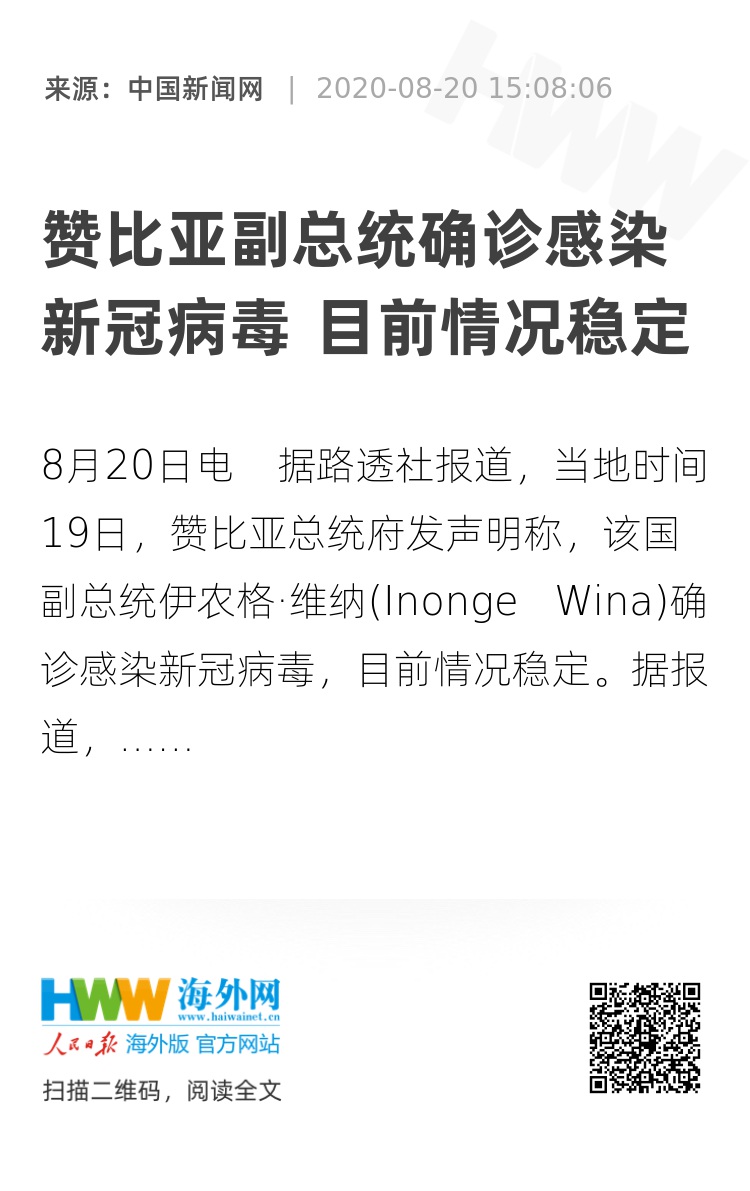 中新网8月20日电 据路透社报道,当地时间19日,赞比亚总统府发声明称,该国副总统伊农格·维纳(Inonge Wina)确诊感染新冠病毒,目前情况稳定。
