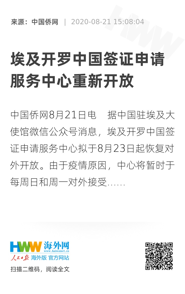 中国侨网8月21日电 据中国驻埃及大使馆微信公众号消息,埃及开罗中国签证申请服务中心拟于8月23日起恢复对外开放。由于疫情原因,中心将暂时于每周日和周一对外接受签证申请,周四发证,其余时间维持关闭状态。后续将视疫情情况,逐步恢复正常工作秩序,届时另行通知。中国驻埃及使馆在此特别提醒如下: