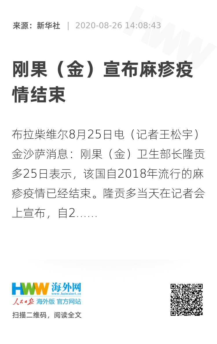 新华社布拉柴维尔8月25日电(记者王松宇)金沙萨消息:刚果(金)卫生部长隆贡多25日表示,该国自2018年流行的麻疹疫情已经结束。