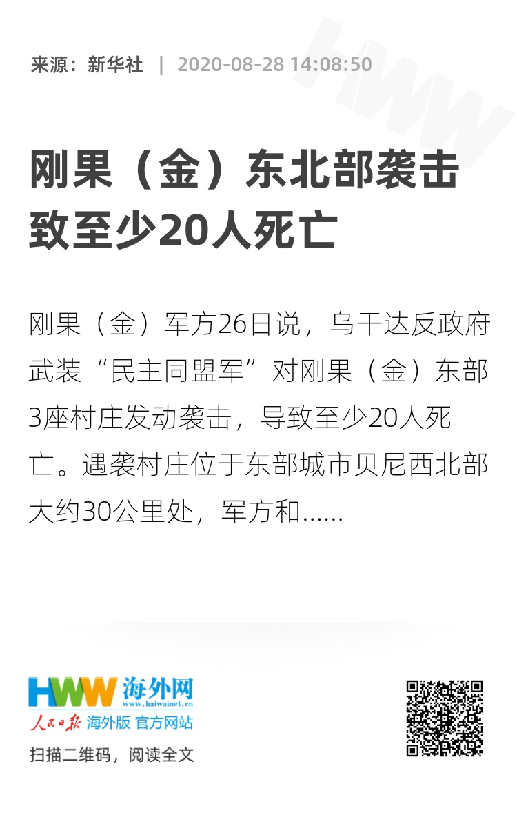 刚果(金)军方26日说,乌干达反政府武装“民主同盟军”对刚果(金)东部3座村庄发动袭击,导致至少20人死亡。