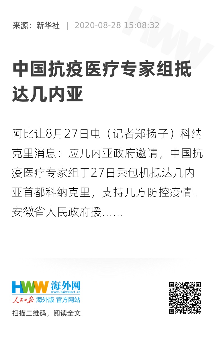 新华社阿比让8月27日电(记者郑扬子)科纳克里消息:应几内亚政府邀请,中国抗疫医疗专家组于27日乘包机抵达几内亚首都科纳克里,支持几方防控疫情。安徽省人民政府援几抗疫物资同机抵达。