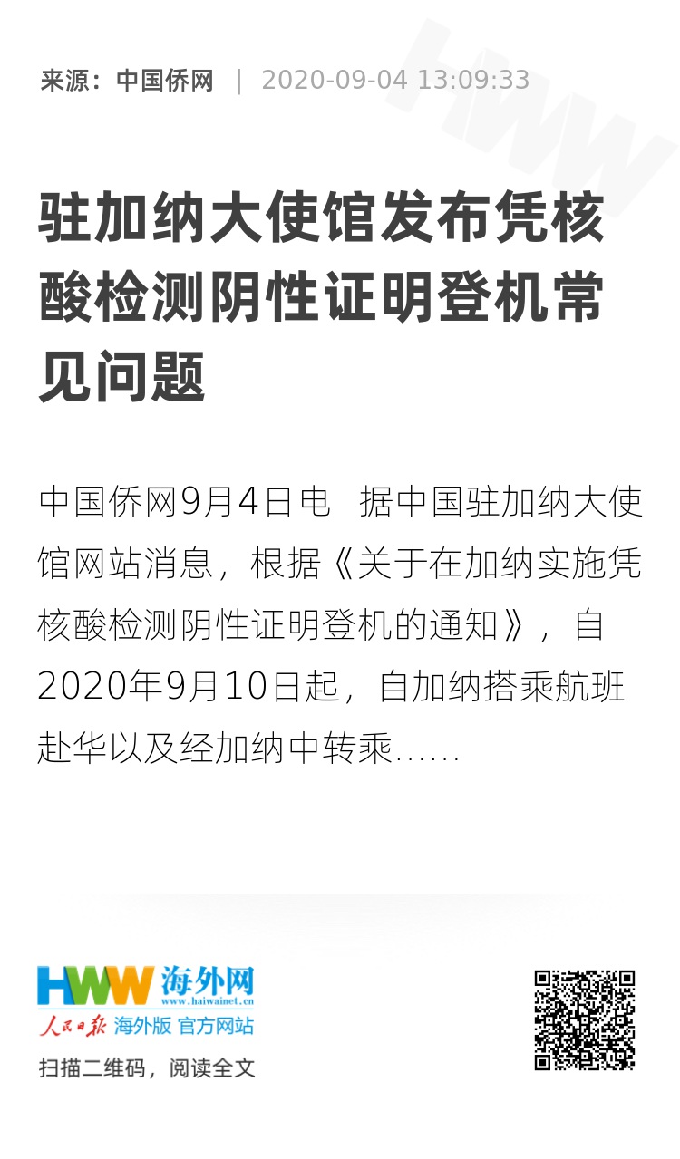 中国侨网9月4日电 据中国驻加纳大使馆网站消息,根据《关于在加纳实施凭核酸检测阴性证明登机的通知》,自2020年9月10日起,自加纳搭乘航班赴华以及经加纳中转乘机赴华的中、外籍乘客,须凭新冠病毒核酸检测阴性证明申领带“HS”标识的绿色健康码或健康状况声明书。现就近期赴华乘客比较关心的问题集中答复如下:
