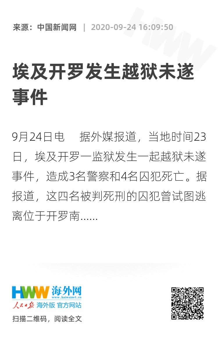 中新网9月24日电 据外媒报道,当地时间23日,埃及开罗一监狱发生一起越狱未遂事件,造成3名警察和4名囚犯死亡。
