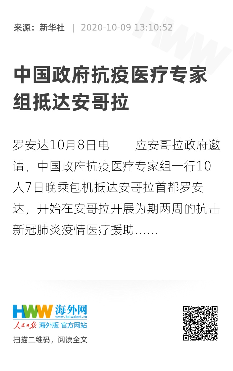 新华社罗安达10月8日电 应安哥拉政府邀请,中国政府抗疫医疗专家组一行10人7日晚乘包机抵达安哥拉首都罗安达,开始在安哥拉开展为期两周的抗击新冠肺炎疫情医疗援助工作。
