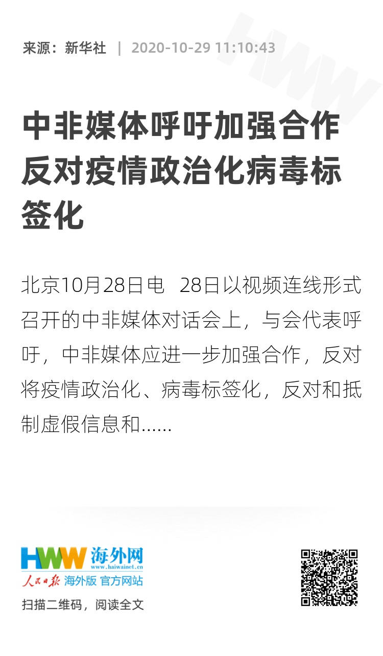 新华社北京10月28日电 28日以视频连线形式召开的中非媒体对话会上,与会代表呼吁,中非媒体应进一步加强合作,反对将疫情政治化、病毒标签化,反对和抵制虚假信息和污名化做法,坚决捍卫国际社会公平正义,共同讲好中非团结抗疫感人故事,为重启发展中国家后疫情时代的经济社会发展、深化中非各领域务实合作、推动构建更加紧密的中非命运共同体贡献积极力量。