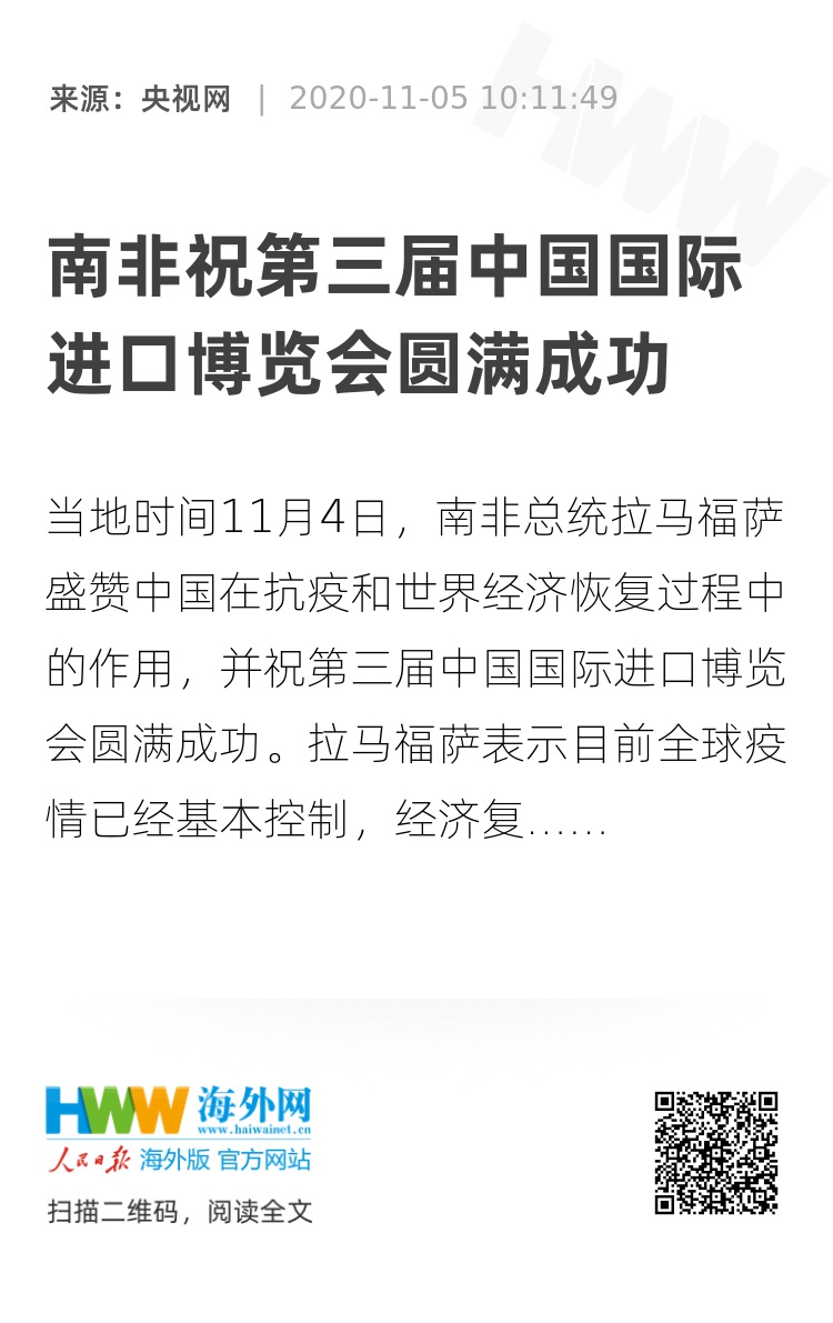 当地时间11月4日,南非总统拉马福萨盛赞中国在抗疫和世界经济恢复过程中的作用,并祝第三届中国国际进口博览会圆满成功。